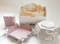 カルトナージュとは、美しい柄の布や紙で雑貨を飾り付けるフランスの伝統工芸です。18世紀ごろに繭を運ぶ入れ物に装飾したのが始まりとされています。フランス語で厚紙を意味する「カルトン」から、この名前が付けられました。