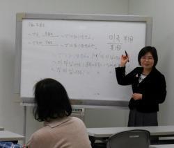 光州市出身、朝鮮大修了の金光淑(キムカンスク)さんが講師を務める。「『あの人』は「ジョサラー」。では『この人』は?」「この、その、あのといった指示語はよく使うので、しっかり覚えて」。ただ文章や単語を読むだけでなく、受講生に語りかけ、質問をしながら一緒に考え、学習を進めていく。