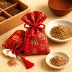 数種類の天然香原料からお好みのものを選び、香りのバランスを確認しながら調合します。常温で香る原料を使用し、完成した香りを金襴の布袋に詰め、綿と紐で仕上げます。タンスや玄関、寝室などに置いて香りを楽しめます。