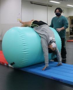 高橋さんは受講生に応じた練習やアドバイスを心がけている。例えば、後ろ向きにジャンプすることが怖い受講生には、直径1メートルほどの円筒状の補助器具を使い、ブリッジの状態での回転に慣れてもらう。転がれるようになった受講生には、空中の動作や着地の姿勢について助言する。習得が近い受講生もいて、なぜできていないかを解説し、動きを修正している。