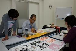 田守さんは応用編としてえとの漢字の色紙や俳句の短冊の書き方、前衛書なども教える。しかし「基本を習得してこそ創作が生きる」と基礎の大切さを強調する。「書に親しむ人は長生きが多い。集中して書くことは充実感を得ることにつながり、ストレス解消にもなるでしょう」と語った。